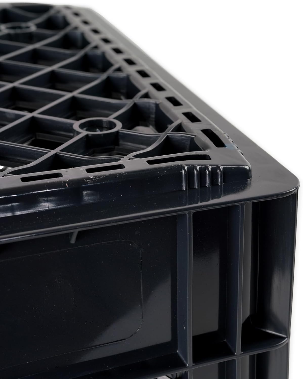 The reinforced grid design provides strong structural integrity, with thick plastic walls that offer minimal flex. Built for long-term, heavy use - comparable to premium heavy-duty crates.